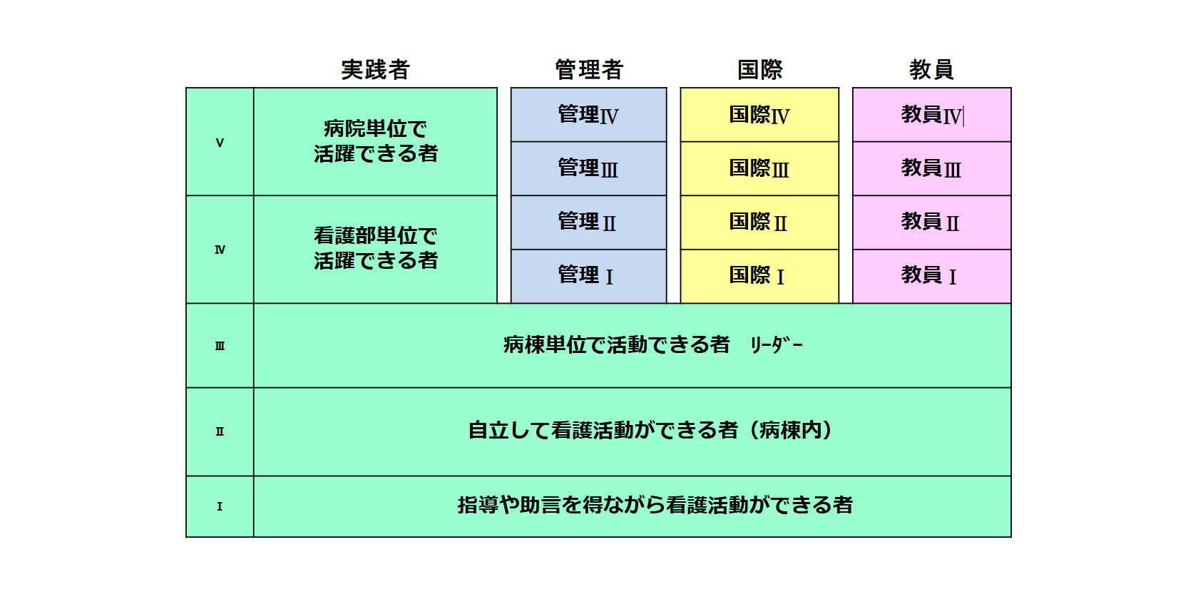 赤十字施設の看護師キャリア開発ラダーは、実践者ラダーが基盤となり実践者ラダーⅢに達するとそのまま実践者ラダーを目指すのか、管理者ラダー、国際ラダー、教員ラダーを目指すのか自分の目指すキャリアを積み重ねていきます。