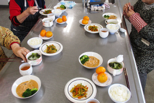 当院管理栄養士による献立作成のポイント等の講義の後、参加者全員で実際に1食分を調理し実食します。計量をしながらの調理なので、やりなれないところもあるかと思いますが、食品の概算量を知ることは健康的な食事を継続するために重要と考えます。